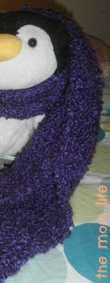 My models are in bed (asleep? nah, probably not) so I had to find something else to model the new scarf. Abby's penguin pillow pet seemed up for the job. :)